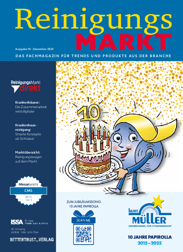 ReinigungsMarkt ist das Magazin für die Reinigungsbranche. Seit fast 25 Jahren versorgt die Fachzeitschrift Einkäufer und Entscheider mit Informationen rund um die Themen Reinigung und Hygiene.