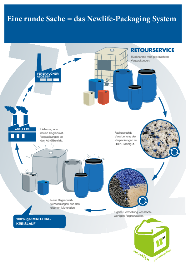 Kunden reduzieren somit ihren CO²-Ausstoß gegenüber einer thermischen Verwertung durch das Newlife-Packaging-System und aus alten Flaschen, Fässern und Kanistern entstehen neue Gebinde. Am Ende des Jahres erhält der Kunde ein Zertifikat über seine theoretische CO2-Ersparnis.